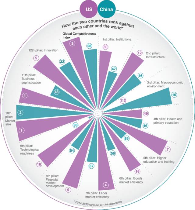 該論壇發(fā)布的最新版全球競(jìng)爭(zhēng)力指數(shù)顯示,美國在最具競(jìng)爭(zhēng)力經(jīng)濟(jì)體中排行第三,繼續(xù)領(lǐng)跑世界經(jīng)濟(jì)似乎不成問題。相比來,中國在同一排行榜上只位列28名,而且目前也只是世界第二大經(jīng)濟(jì)體。